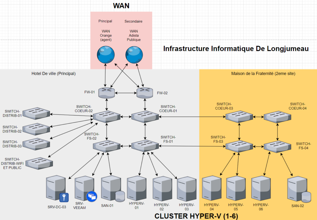 Pour garantir la continuité des services, notre infrastructure repose sur une redondance au niveau du cœur de réseau, du stockage (SAN) et des hyperviseurs. Ces derniers sont regroupés en cluster de six nœuds Hyper-V afin d’assurer une haute disponibilité des machines virtuelles. Le stockage est centralisé sur un SAN redondé, garantissant la protection et la disponibilité des données critiques. Toutefois, notre connexion WAN demeure un point unique de sortie via deux firewalls. L’objectif à terme est de renforcer cette architecture en intégrant une sortie réseau supplémentaire pour assurer une redondance complète.