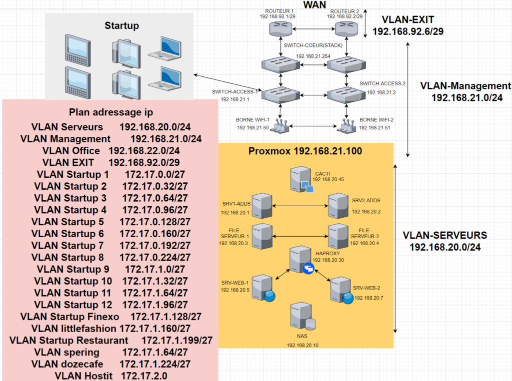 - Chaque startup dispose de son propre VLAN avec un plan d’adressage dédié.