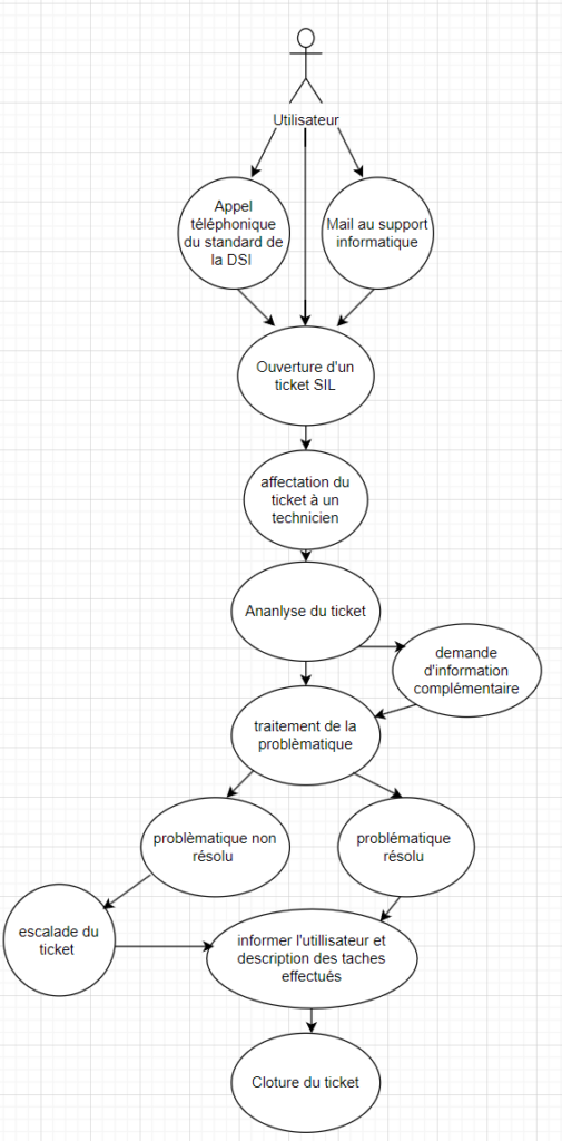 L’utilisateur rencontre un problème informatique (ex. panne de logiciel, problème réseau, matériel défectueux ect…). il initie une demande d’assistance.
