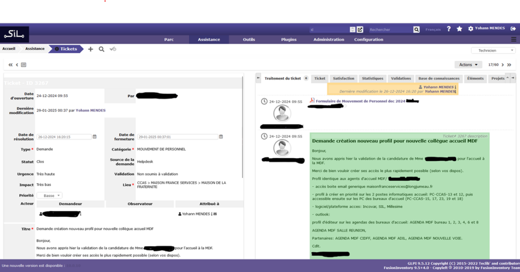 Si la demande a été faite par mail ou téléphone, un agent du support informatique crée le ticket à sa place dans GLPI.